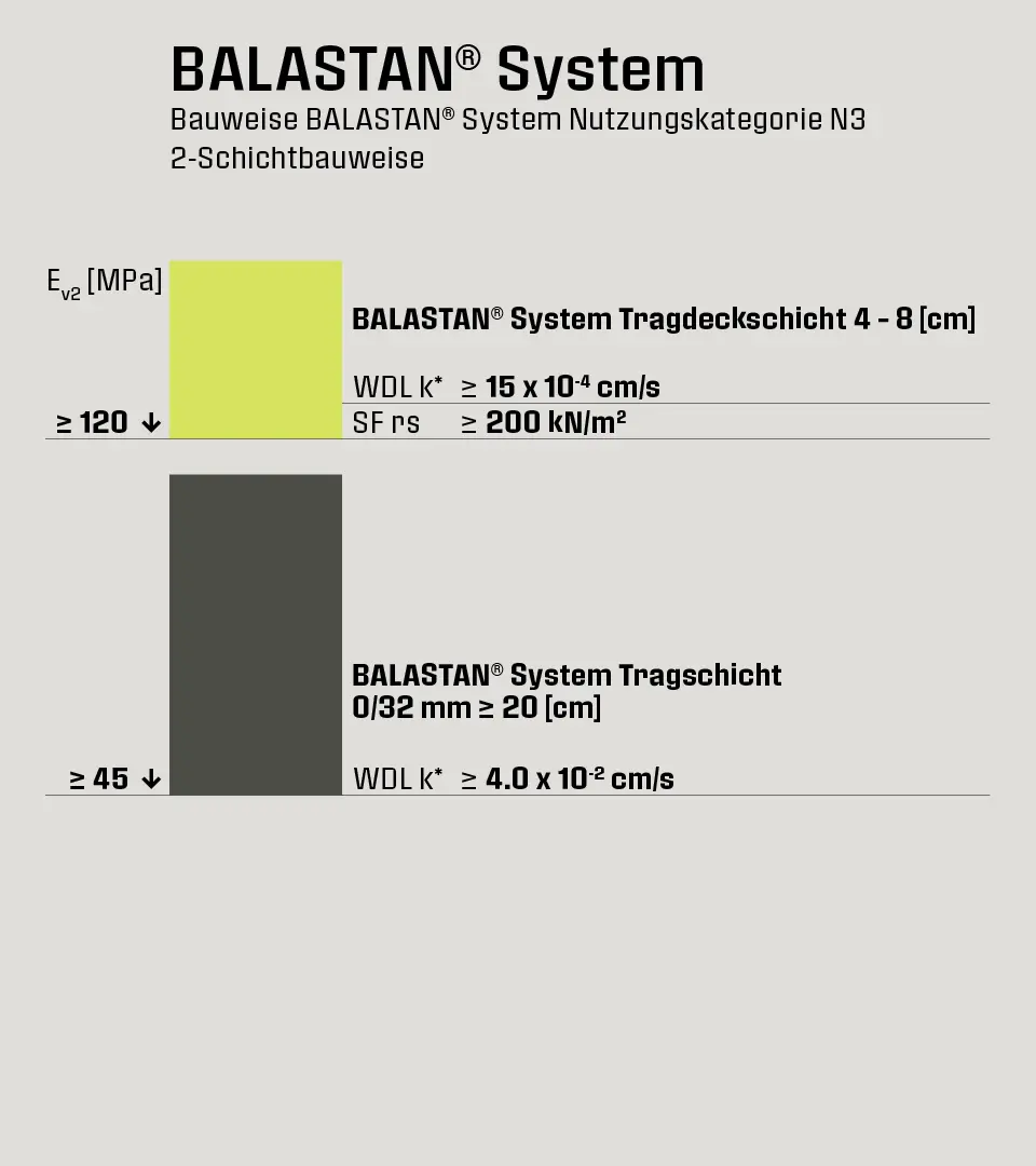 Das BALASTAN®-System bietet innovative Möglichkeiten, wenn es um langlebige und frostbeständige Entsiegelungen von Rad- und Wirtschaftswegen geht – selbst in sensiblen Naturschutzgebieten. BALASTAN® vereint schwerlastgeeignete Tragfähigkeit mit außergewöhnlicher Versickerungsfähigkeit und ist dabei extrem leistungsstark und kosteneffizient. So trägt das System aktiv zur Klimaanpassung und einer effektiven Flächennutzung bei: für Wege, die unsere Infrastruktur nachhaltig verbessern.